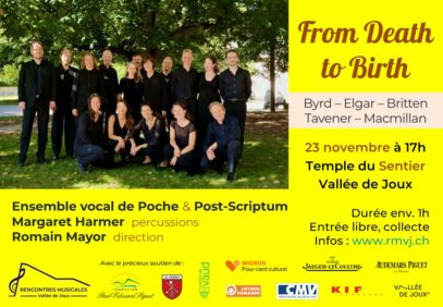 Fondé en 2007 par Romain Mayor, l’ensemble vocal Post-Scriptum cultive comme répertoire de prédilection les musiques des 20e et 21e siècles qu’il met en regard avec des œuvres plus anciennes. Cette démarche se retrouve dans le programme From Death to Birth, dans lequel se mêlent des compositions de la fin de la Renaissance – de William Byrd ou Peter Philips –, avec des pièces plus récentes d’autres grands noms de la musique britannique tels qu’Edward Elgar, Benjamin Britten, John Tavener ou encore James MacMillan.