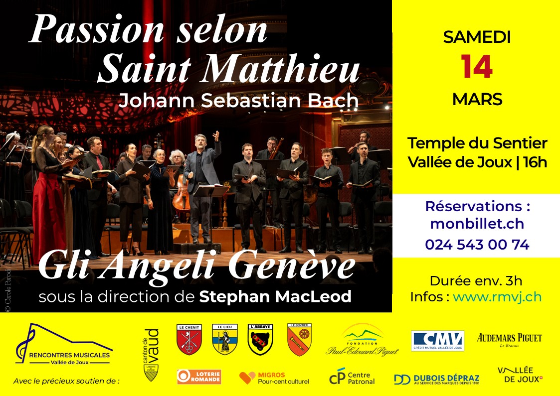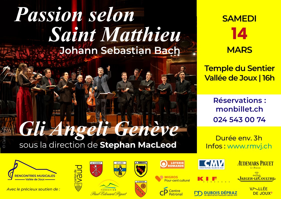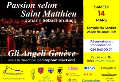 Les Rencontres Musicales de la Vallée de Joux ont le plaisir d’accueillir une nouvelle fois l’ensemble Gli Angeli Genève pour interpréter, dans le cadre d’un concert exceptionnel, la Passion selon Saint Matthieu de Bach, samedi 14 mars au Temple du Sentier.