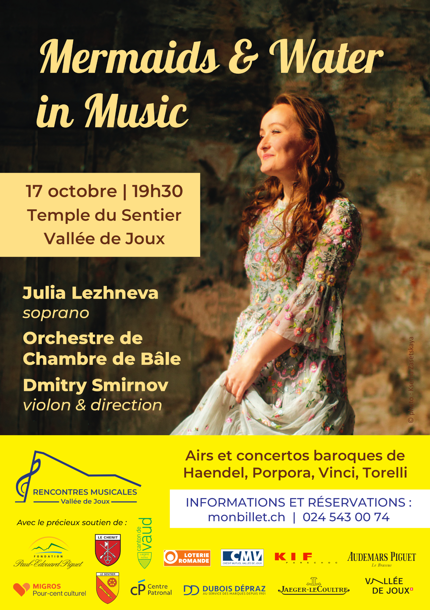Vendredi 17 octobre au Temple du Sentier, la soprano Julia Lezhneva et l’Orchestre de Chambre de Bâle, sous la direction du premier violon Dmitry Smirnov, interpréteront en première mondiale le programme « Mermaids & Water in Music », composé d’œuvres de Haendel, Porpora, Vinci ou encore Torelli.